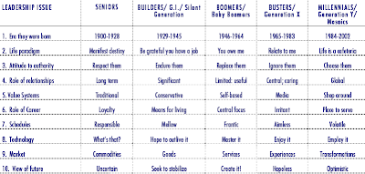 The Gen Y generation has a very short attention span and find it just as difficult to make a commitment as the Gen Xers. Gen Y’s take more time to get ready in the morning than any previous generation. They communicate and live in their little bubbles. Gen Y’s have multiple visions and lack a clear calling in their lives. They are staying in adolescence longer. It is comfortable, easy, few responsibilities, plenty of money, and life is fun and that’s the meaning of life. If it’s not fun, it’s not worth pursuing. The new 18 is now 26. Adolescence for Gen Y now doesn’t end until they reach 30 years. Over the next two decades, millions of baby boomers and Gen X will be retiring and the Gen Y is not ready to step into leadership positions.